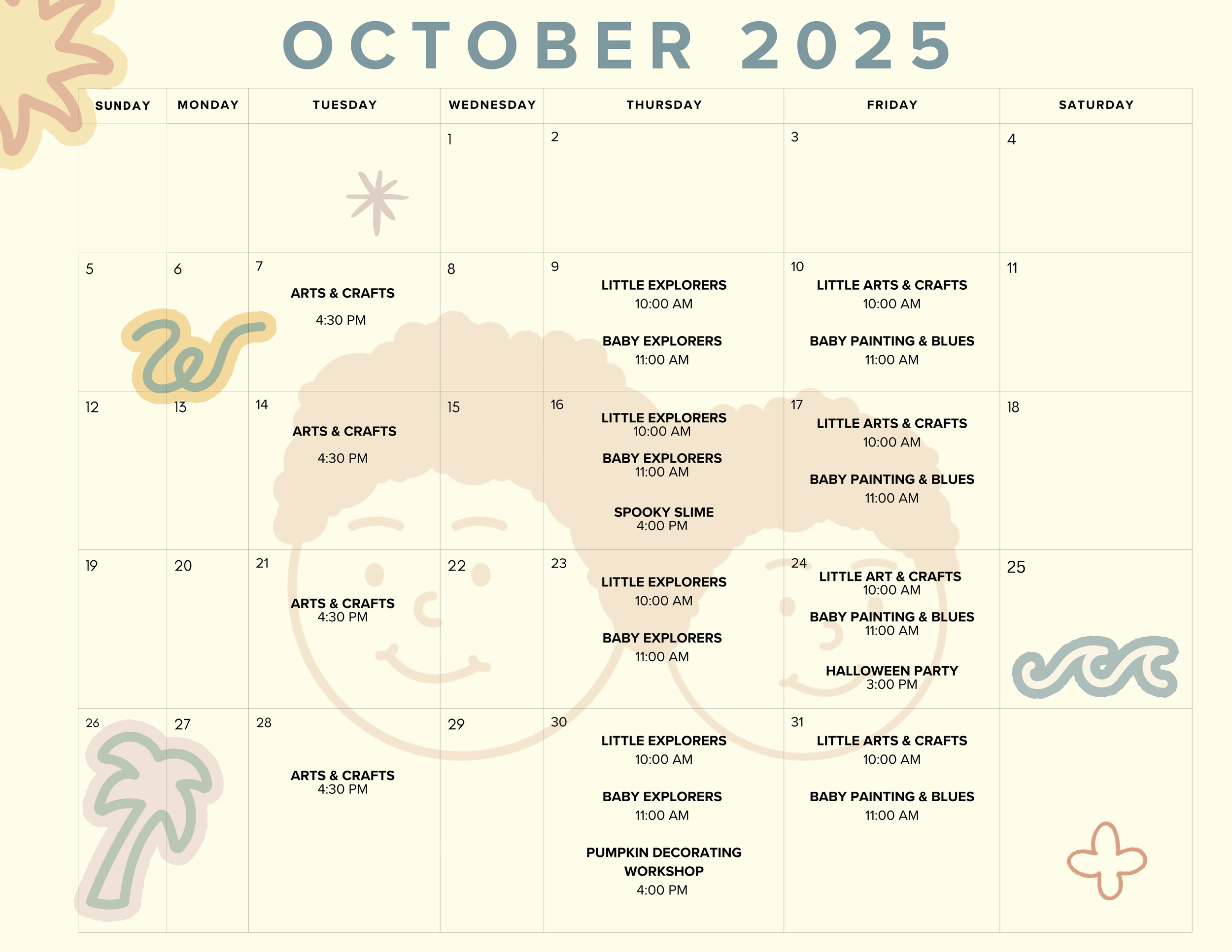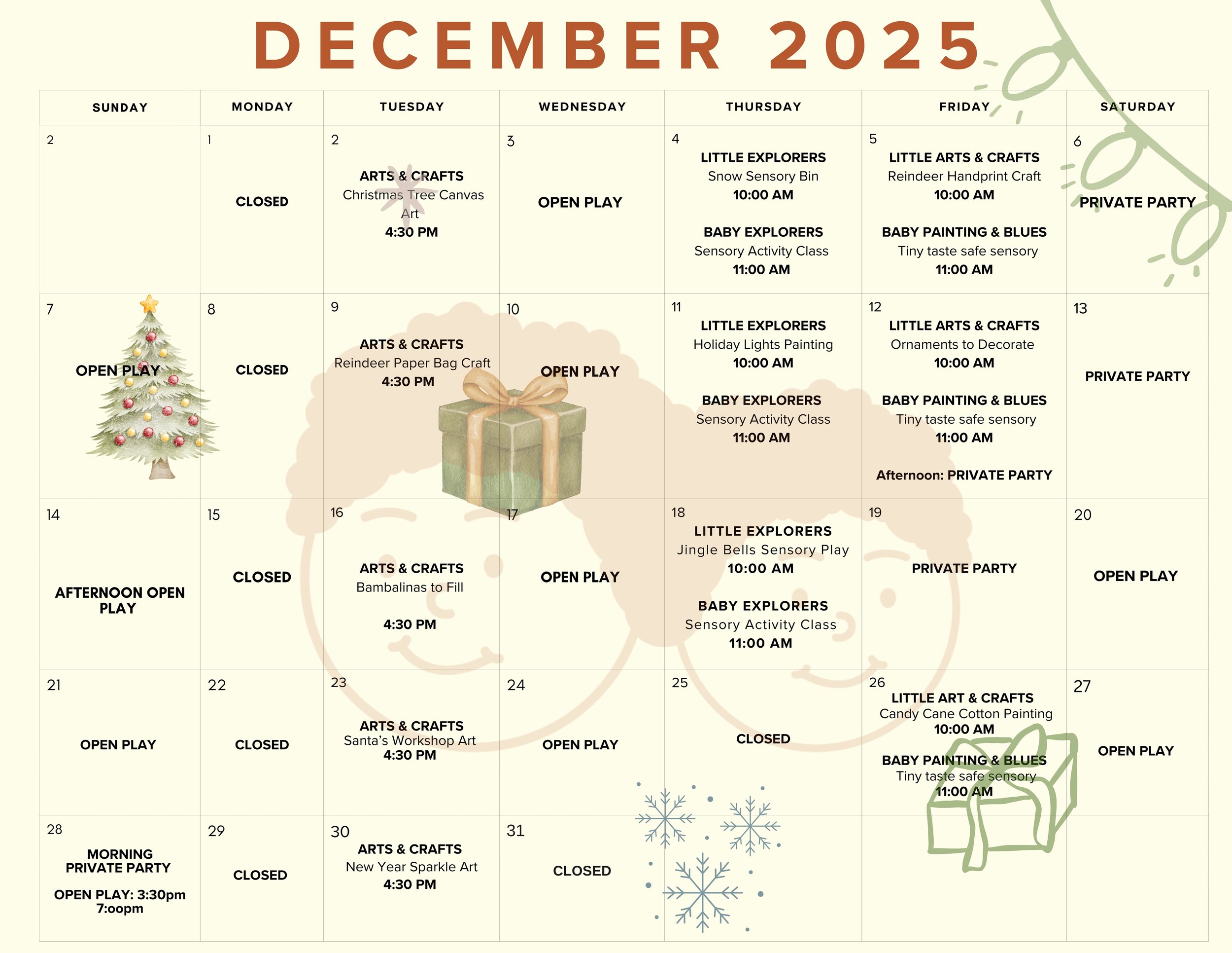 Our classes nurture connection, spark curiosity, and support early development through play, creativity, and exploration. With options for every age from 6 months to 4 years — from sensory play to arts, crafts, and movement — explore our weekly schedule, descriptions, and pricing to find the perfect fit for your little one.